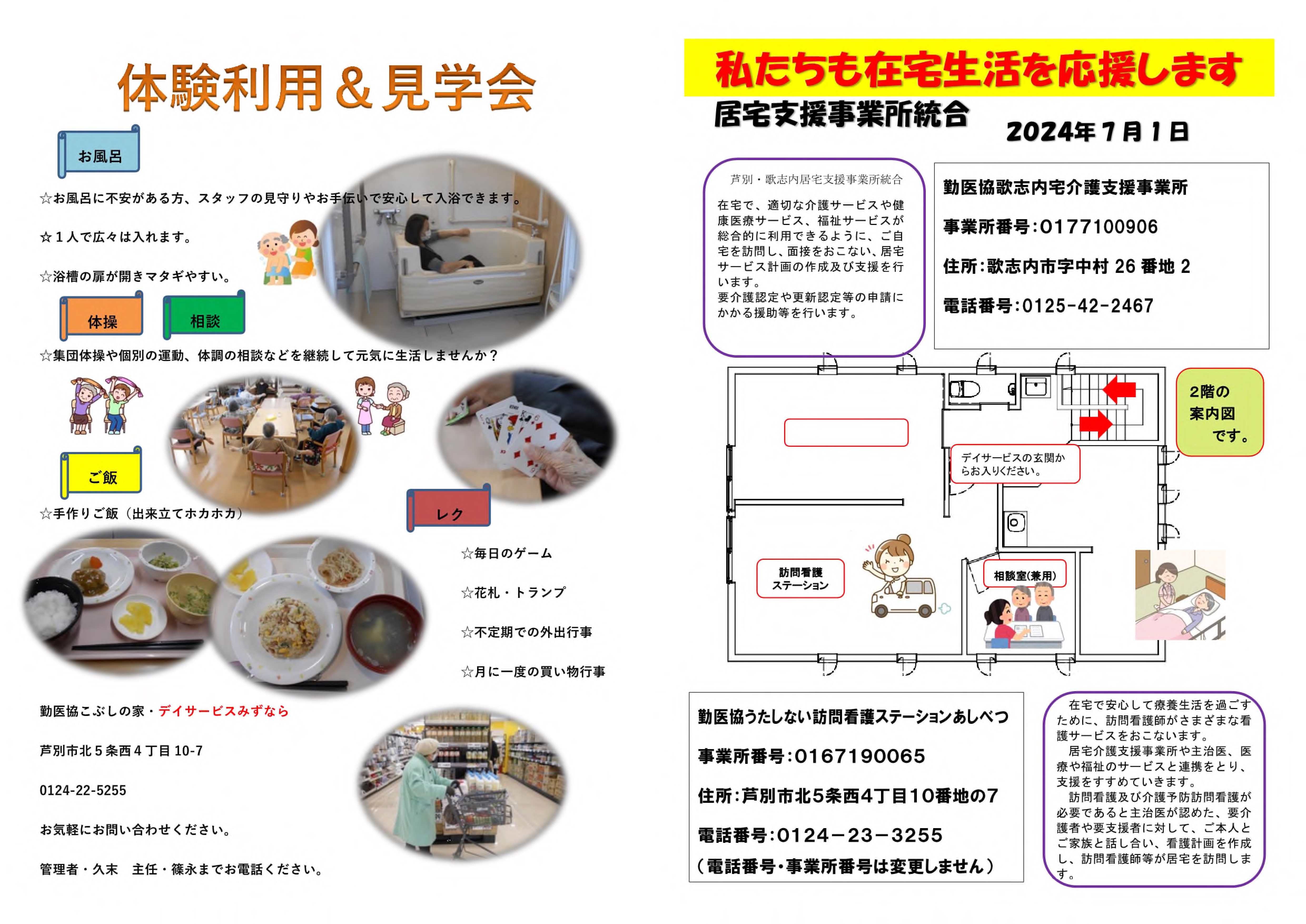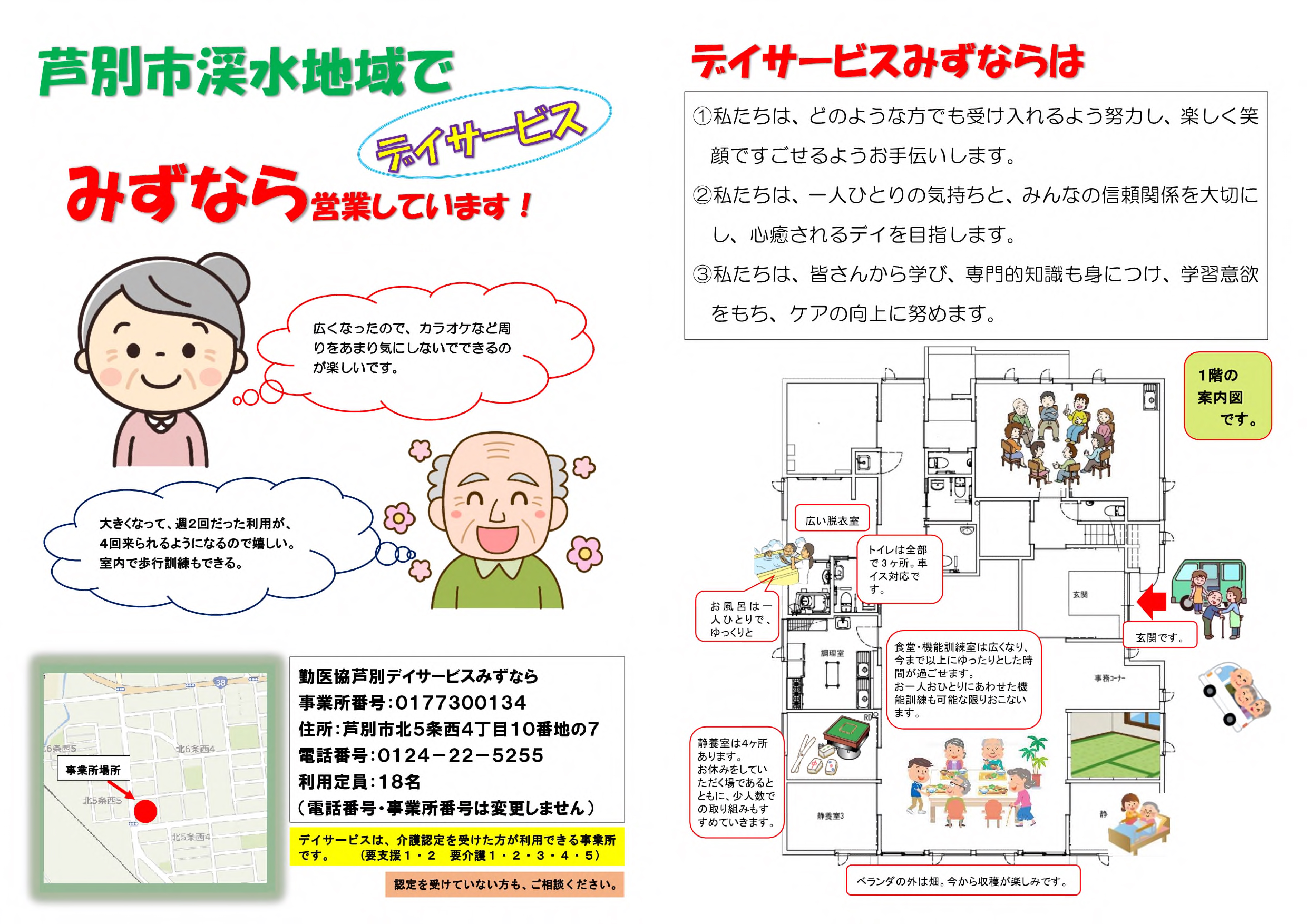 勤医協芦別デイサービスみずなら 地域密着型通所介護【小規模デイサービス】 事業所概要 勤医協芦別デイサービスみずなら パンフレット紹介 勤医協芦別デイサービスみずなら パンフレット紹介 パンフレット印刷はこちらから 事業所概要 事業所概要 住所〒075-0005芦別市北5条西4丁目10-7電話番号0124-22-5255FAX番号0124-22-5355営業日営業時間月曜日~土曜日 但し 12月31日~1月3日を除く午前9時~午後5時サービス提供地域芦別市・赤平市重要事項の掲示重要事項説明書 アクセス アクセス 勤医協芦別赤平在宅総合センター 地域密着型通所介護【小規模デイサービス】 サービス紹介TOP