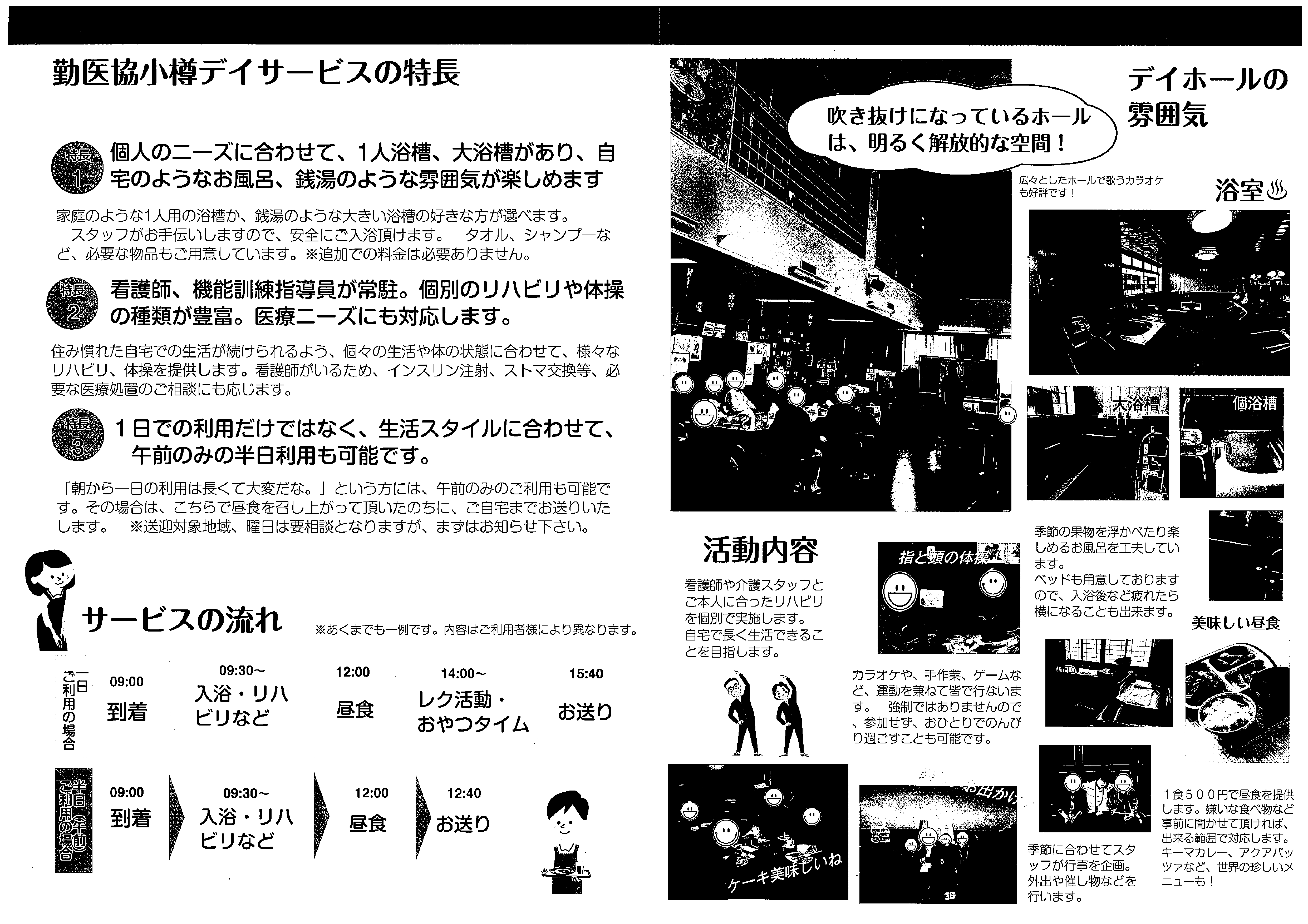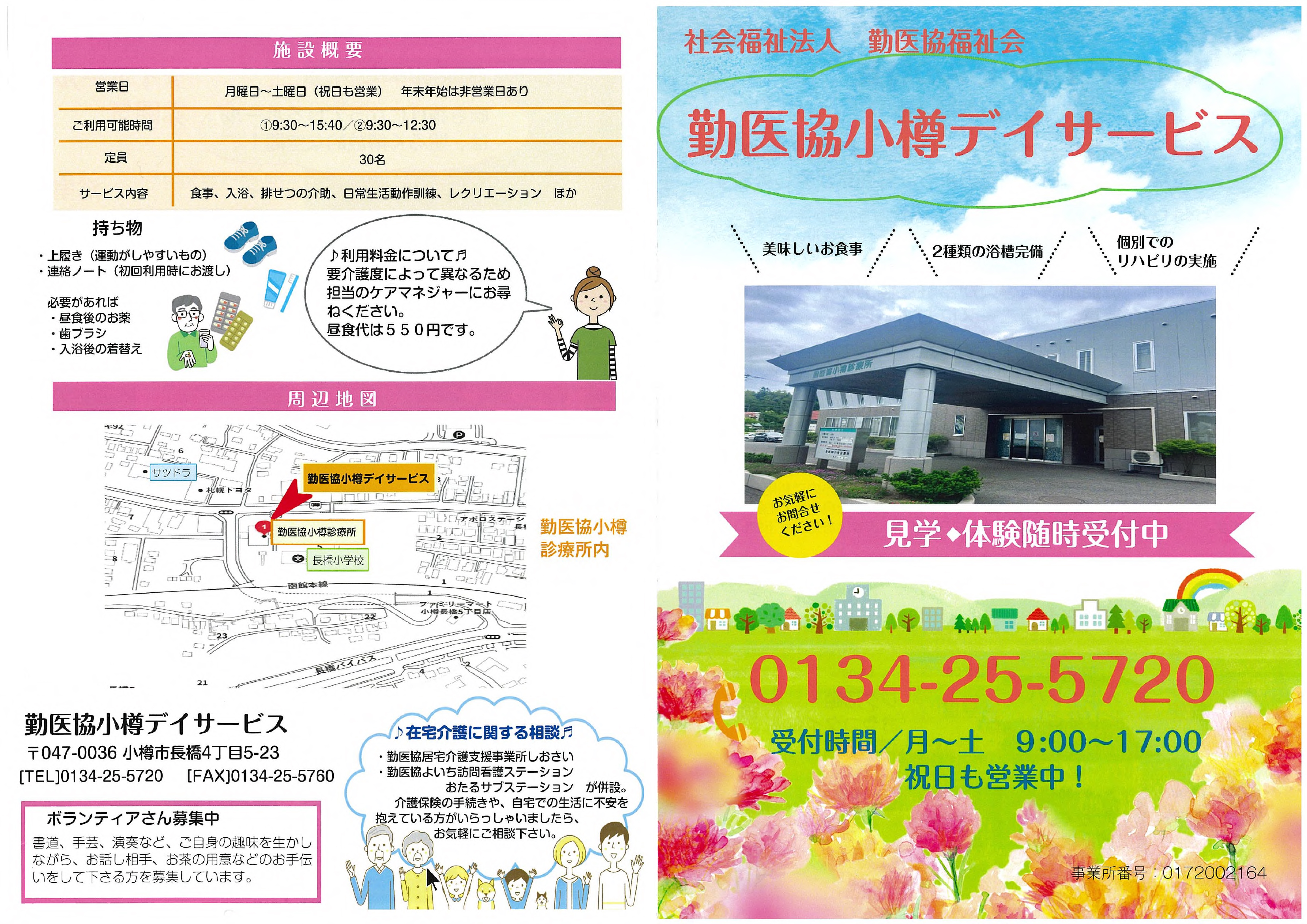 勤医協小樽デイサービス 通所介護【デイサービス】 事業所概要 アクセス 勤医協小樽デイサービス パンフレット紹介 勤医協小樽デイサービス パンフレット紹介 勤医協小樽デイサービス パンフレット紹介 勤医協小樽デイサービス パンフレット紹介 パンフレット印刷はこちらから 事業所概要 事業所概要 住所〒047-0036小樽市長橋4丁目5番23号電話番号0134-25-5720FAX番号0134-25-5760営業日営業時間月曜日~土曜日 但し 1月1日~1月3日を除く午前9時~午後5時サービス提供地域小樽市(但し、桃内・忍路・蘭島・星野町・春香町・張碓町・桂岡町・見晴町・銭函を除く)重要事項の掲示重要事項説明書 アクセス アクセス 中央バス 長橋小学校前下車⇒徒歩(約1分) 勤医協小樽余市在宅総合センター 通所介護【デイサービス】 サービス紹介TOP