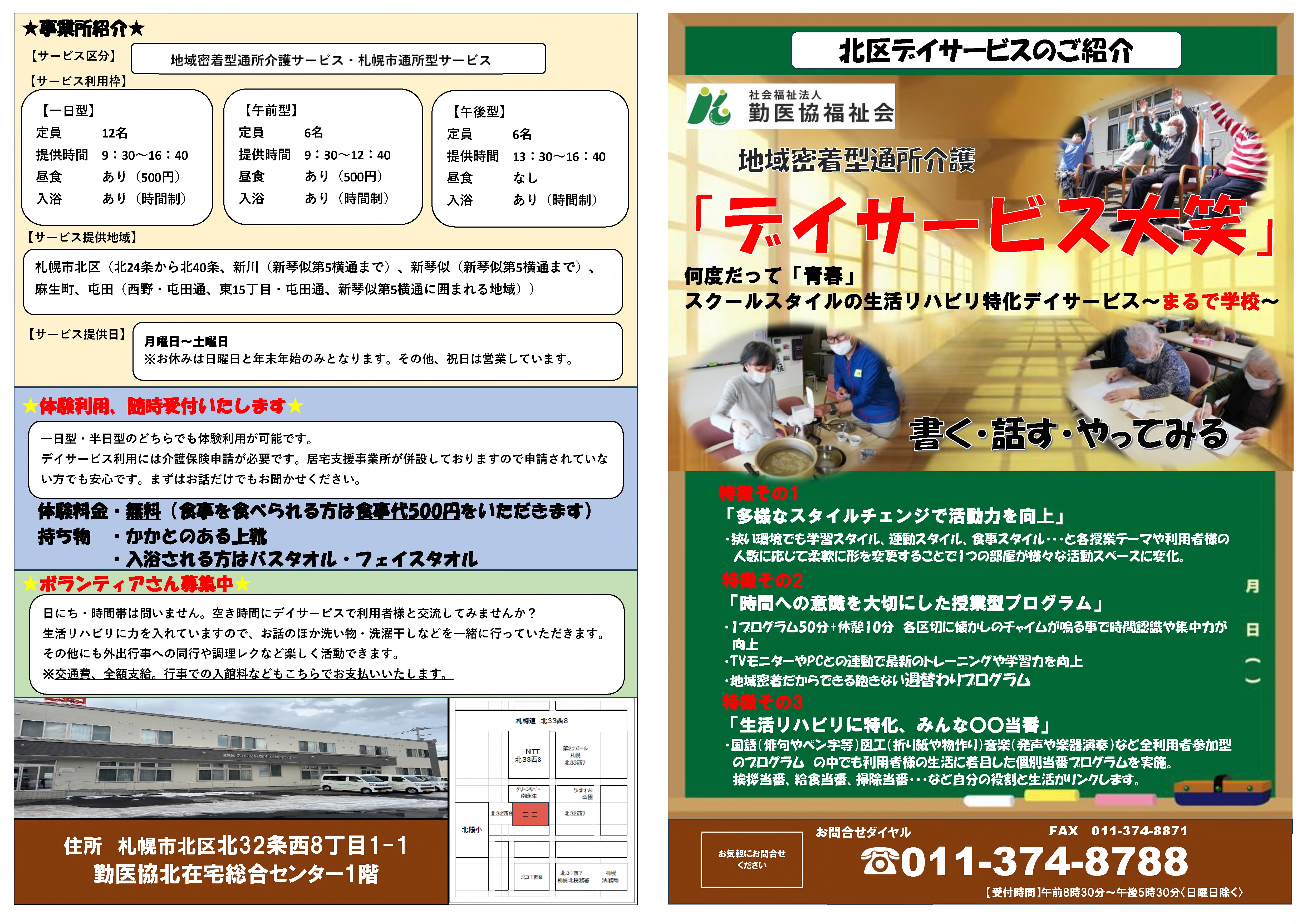 勤医協デイサービス大笑 地域密着型通所介護【小規模デイサービス】 事業所概要 アクセス 勤医協デイサービス大笑 パンフレット紹介 勤医協デイサービス大笑 パンフレット紹介 勤医協デイサービス大笑 パンフレット紹介 勤医協デイサービス大笑 パンフレット紹介 パンフレット印刷はこちらから 事業所概要 事業所概要 住所〒001-0032札幌市北区北32条西8丁目1-1電話番号011-374-8788FAX番号011-374-8871営業日営業時間月曜日~土曜日 但し 12月31日~1月2日を除く午前9時00分~午後5時サービス提供地域札幌市北区(北24条から北40条、新川(新琴似第5横通まで)、新琴似(新琴似第5横通まで)、麻生町、屯田(西野・屯田通、東15丁目・屯田通り、新琴似第5横通に囲まれる地域))重要事項の掲示重要事項説明書 アクセス アクセス アクセス 地下鉄南北線 北34条駅⇒徒歩(約10分)中央バス(屯田線01)北32条西5丁目⇒徒歩(約8分) 勤医協北在宅総合センター 地域密着型通所介護【小規模デイサービス】 サービス紹介TOP