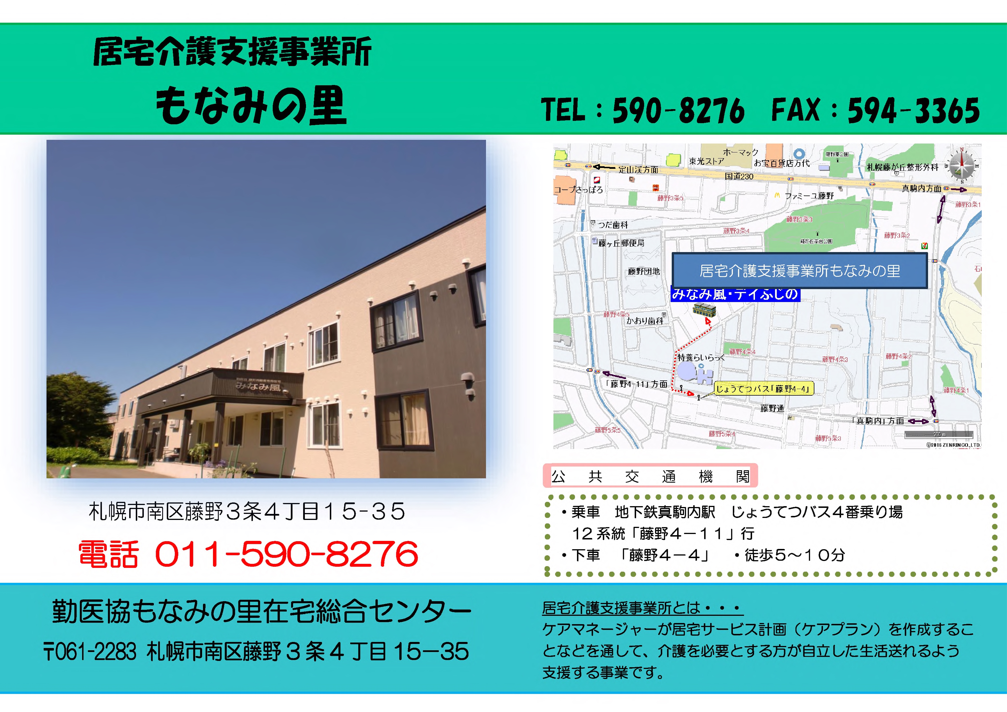 勤医協居宅介護支援事業所もなみの里 居宅介護支援 事業所概要 アクセス 勤医協居宅介護支援事業所もなみの里 パンフレット紹介 勤医協居宅介護支援事業所もなみの里 パンフレット紹介 パンフレット印刷はこちらから 事業所概要 事業所概要 住所〒061-2283札幌市南区藤野3条4丁目15番35号電話番号011-590-8276FAX番号011-594-3365営業日営業時間月曜日~土曜日(日祝祭日、 12月30日~1月3日は非営業日)午前9時~午後5時サービス提供地域札幌市南区・中央区・豊平区重要事項の掲示重要事項説明書 アクセス アクセス 地下鉄南北線真駒内駅⇒じょうてつバス4番乗り場 12系統「藤野4-11」行き ⇒「藤野4-4」下車 徒歩5~10分 勤医協もなみの里在宅総合センター 居宅介護支援 サービス紹介TOP