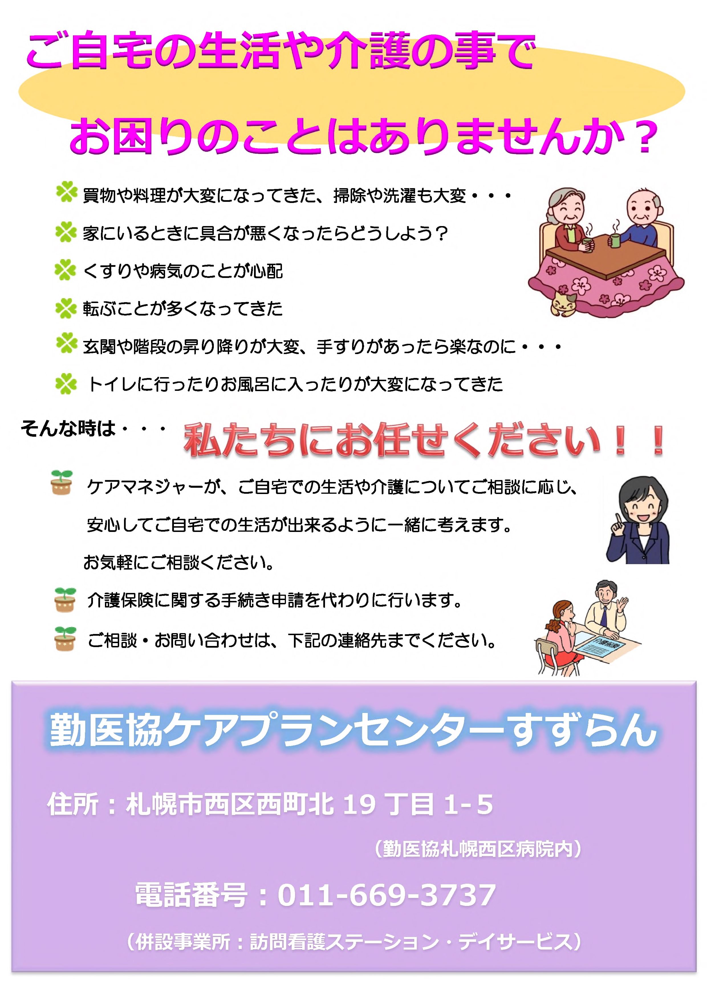 勤医協ケアプランセンターすずらん 居宅介護支援 事業所概要 アクセス 勤医協ケアプランセンターすずらん パンフレット紹介 勤医協ケアプランセンターすずらん パンフレット紹介 パンフレット印刷はこちらから 事業所概要 事業所概要 住所〒063-0061札幌市西区西町北19丁目1-5 電話番号011-669-3737FAX番号011-661-5100営業日営業時間月曜日~土曜日(日祝祭日、 12月30日~1月3日は非営業日)午前9時~午後5時サービス提供地域札幌市西区・手稲区・北区・中央区重要事項の掲示重要事項説明書 アクセス アクセス アクセス 地下鉄東西線宮の沢駅 5番出口⇒徒歩(約10分)JRバス西町北20丁目停留所降車⇒徒歩(約5分) 勤医協西在宅総合センター 居宅介護支援 サービス紹介TOP