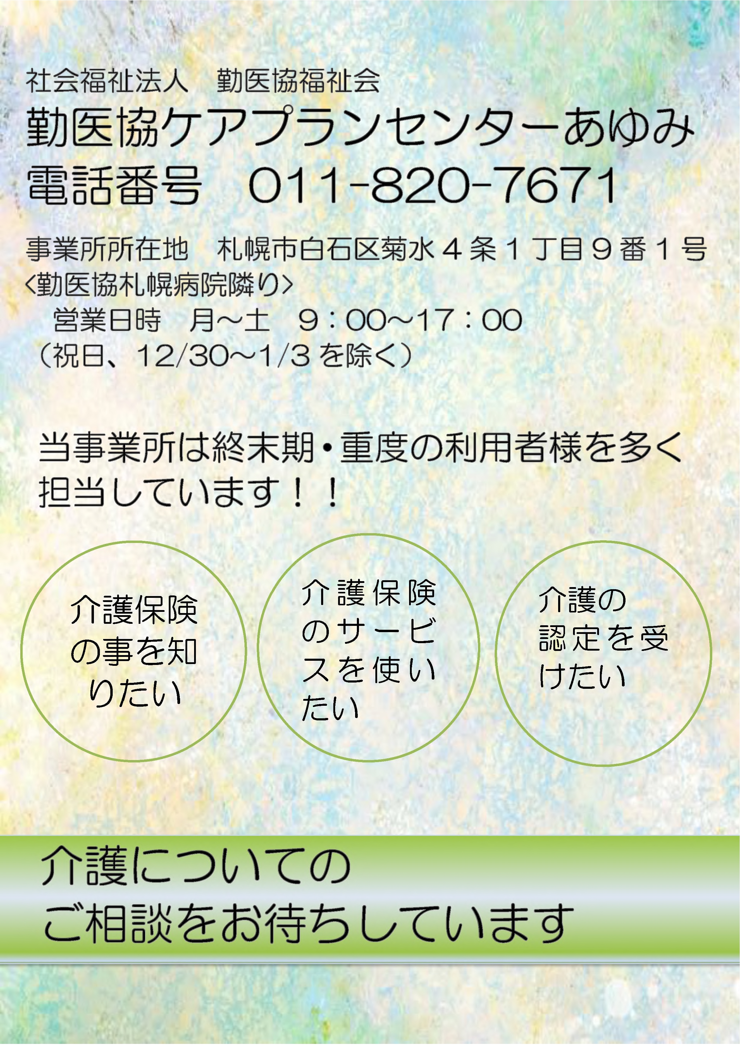 勤医協ケアプランセンターあゆみ 居宅介護支援 事業所概要 アクセス 勤医協ケアプランセンターあゆみ パンフレット紹介 勤医協ケアプランセンターあゆみ パンフレット紹介 パンフレット印刷はこちらから 事業所概要 事業所概要 住所〒003-0804札幌市白石区菊水4条1丁目9-1電話番号011-820-7671FAX番号011-820-1356営業日営業時間月曜日~土曜日(日祝祭日、 12月30日~1月3日は非営業日)午前9時~午後5時サービス提供地域札幌市白石区・中央区・豊平区・東区・清田区・南区・厚別区重要事項の掲示重要事項説明書 アクセス アクセス 地下鉄東西線菊水駅1番出口⇒徒歩(約5分) 勤医協菊水在宅総合センター 居宅介護支援 サービス紹介TOP