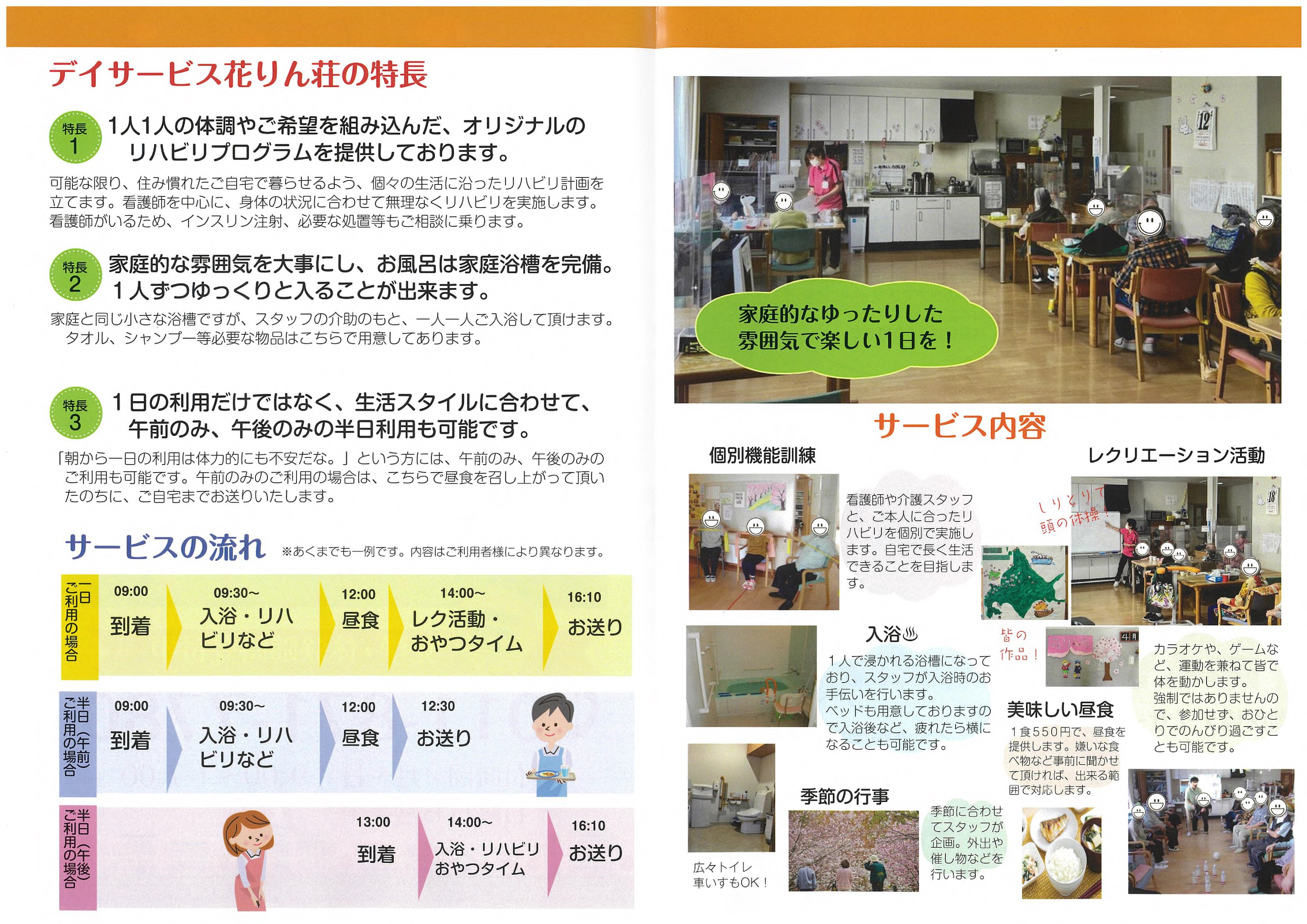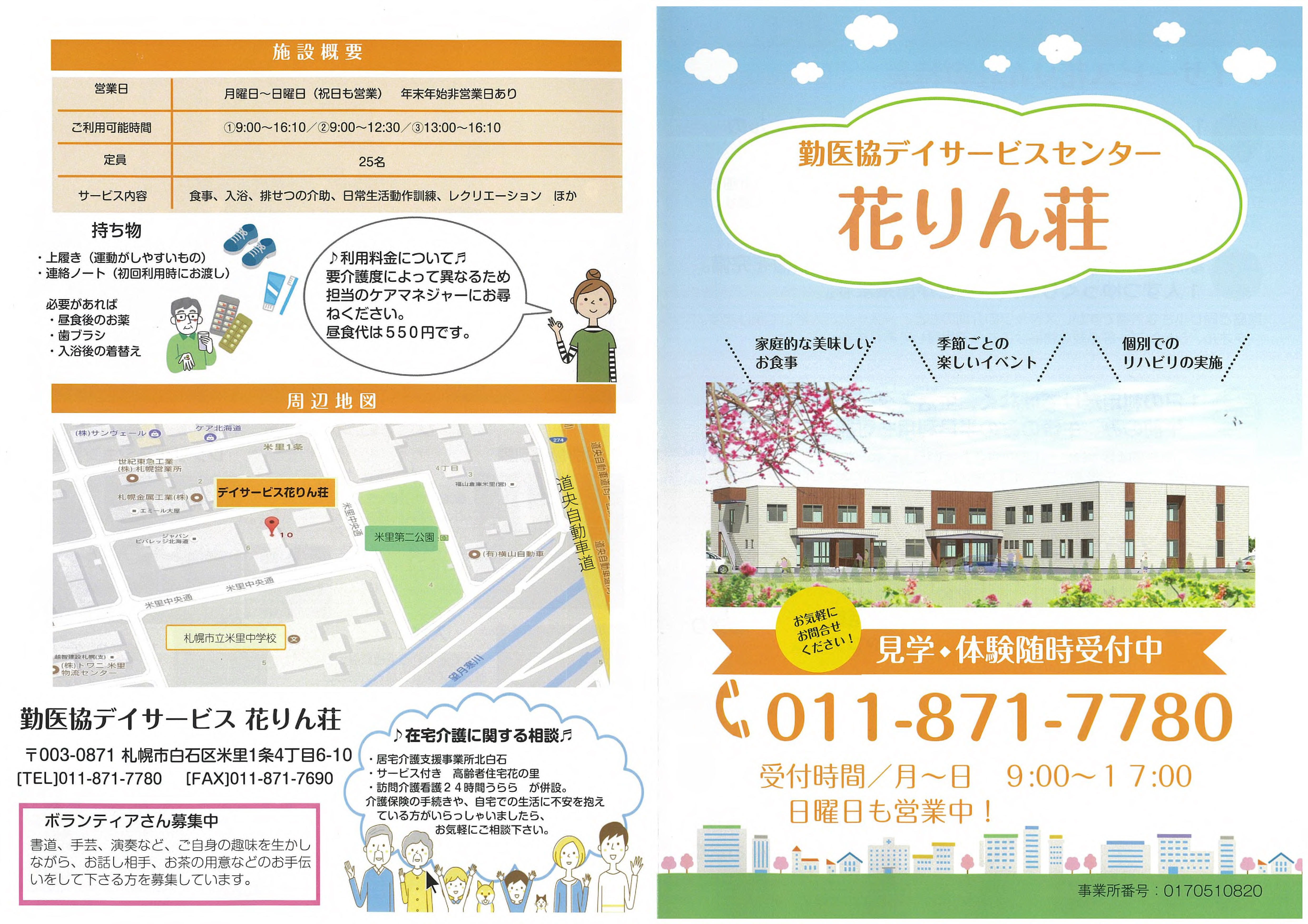 勤医協デイサービスセンター花りん荘 通所介護【デイサービス】 事業所概要 アクセス 勤医協デイサービスセンター花りん荘 パンフレット紹介 勤医協デイサービスセンター花りん荘 パンフレット紹介 勤医協デイサービスセンター花りん荘 パンフレット紹介 勤医協デイサービスセンター花りん荘 パンフレット紹介 パンフレット印刷はこちらから 事業所概要 事業所概要 住所〒003-0871札幌市白石区米里1条4丁目6-10電話番号011-871-7780FAX番号011-871-7690営業日営業時間月曜日~日曜日 但し 1月1日~1月2日を除く午前9時~午後5時サービス提供地域札幌市白石区重要事項の掲示重要事項説明書 アクセス アクセス ジェイ・アール北海道バス菊水元町9条2丁目⇒徒歩(約8分) 勤医協北白石在宅総合センター 通所介護【デイサービス】 サービス紹介TOP