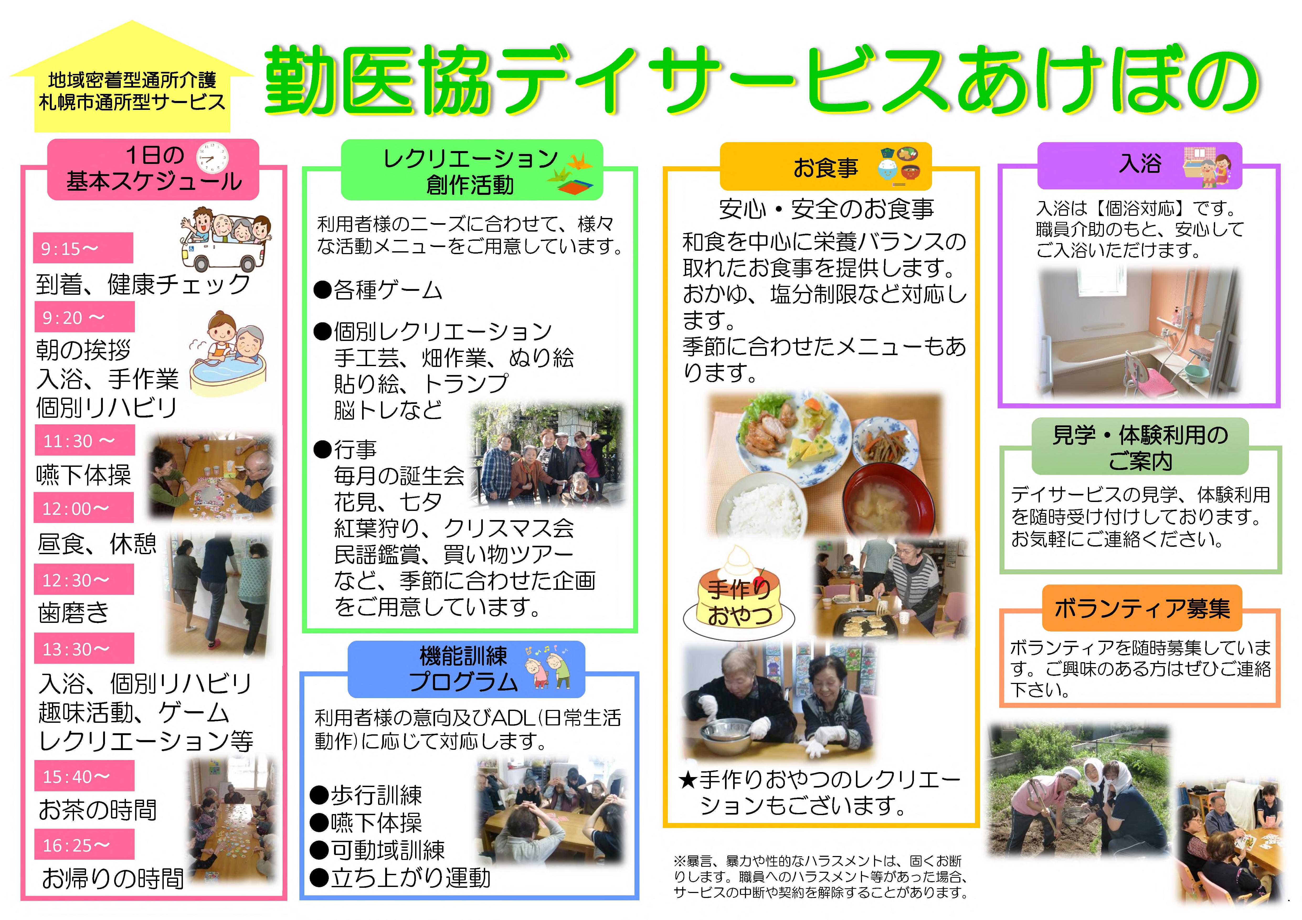 勤医協デイサービスあけぼの 地域密着型通所介護【小規模デイサービス】 事業所概要 アクセス 勤医協デイサービスあけぼの パンフレット紹介 勤医協デイサービスあけぼの パンフレット紹介 パンフレット印刷はこちらから 事業所概要 事業所概要 住所〒006-0834札幌市手稲区曙4条2丁目6-32 電話番号011-688-1700FAX番号011-688-1297営業日営業時間月曜日~土曜日 但し 12月31日~1月2日を除く午前9時~午後5時サービス提供地域札幌市手稲区重要事項の掲示重要事項説明書 アクセス アクセス アクセス JR手稲駅北口よりJRバス山口団地線(手40/手41/宮45)⇒曙4条2丁目停留所降車⇒徒歩(約1分) 勤医協手稲在宅総合センター 地域密着型通所介護【小規模デイサービス】 サービス紹介TOP