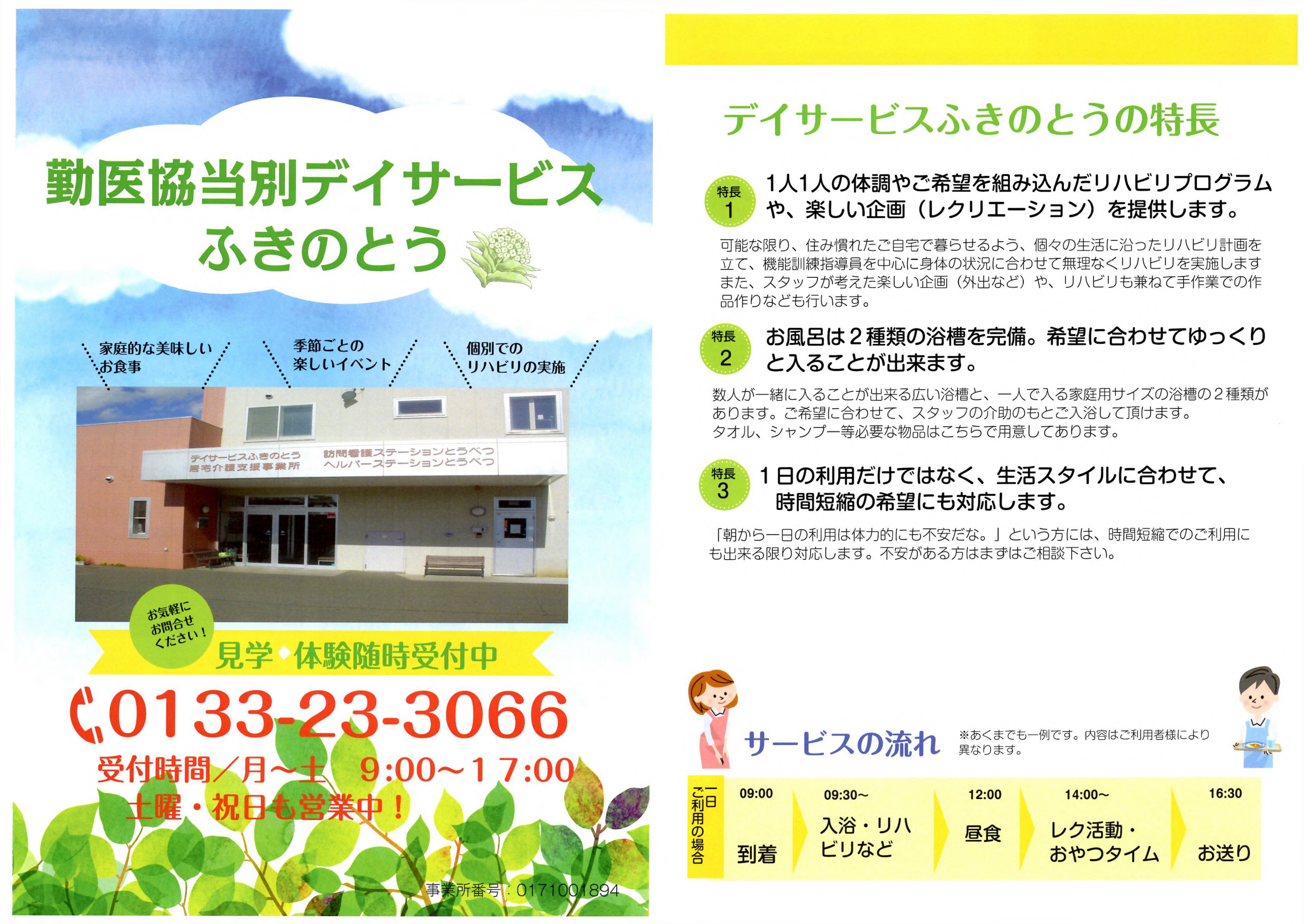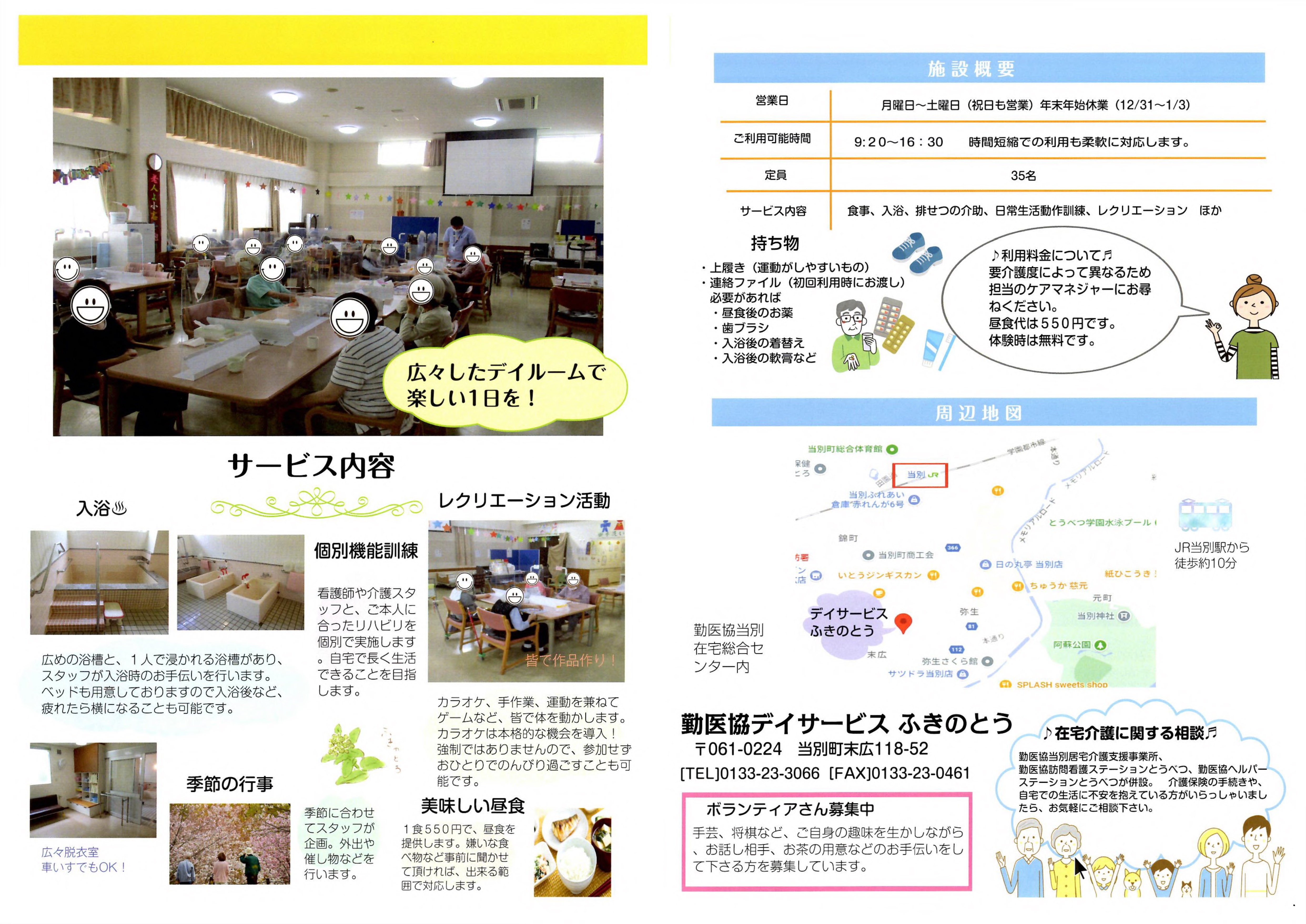 勤医協当別デイサービスふきのとう 通所介護【デイサービス】 事業所概要 アクセス 勤医協当別デイサービスふきのとう パンフレット紹介 勤医協当別デイサービスふきのとう パンフレット紹介 パンフレット印刷はこちらから 事業所概要 事業所概要 住所〒061-0224石狩郡当別町末広118番地52電話番号0133-23-3066FAX番号0133-23-0461営業日営業時間月曜日~土曜日 但し 12月31日~1月3日を除く午前9時~午後5時サービス提供地域石狩郡当別町重要事項の掲示重要事項説明書 アクセス アクセス JR学園都市線 石狩当別駅 下車徒歩10分 勤医協当別在宅総合センター 通所介護【デイサービス】 サービス紹介TOP