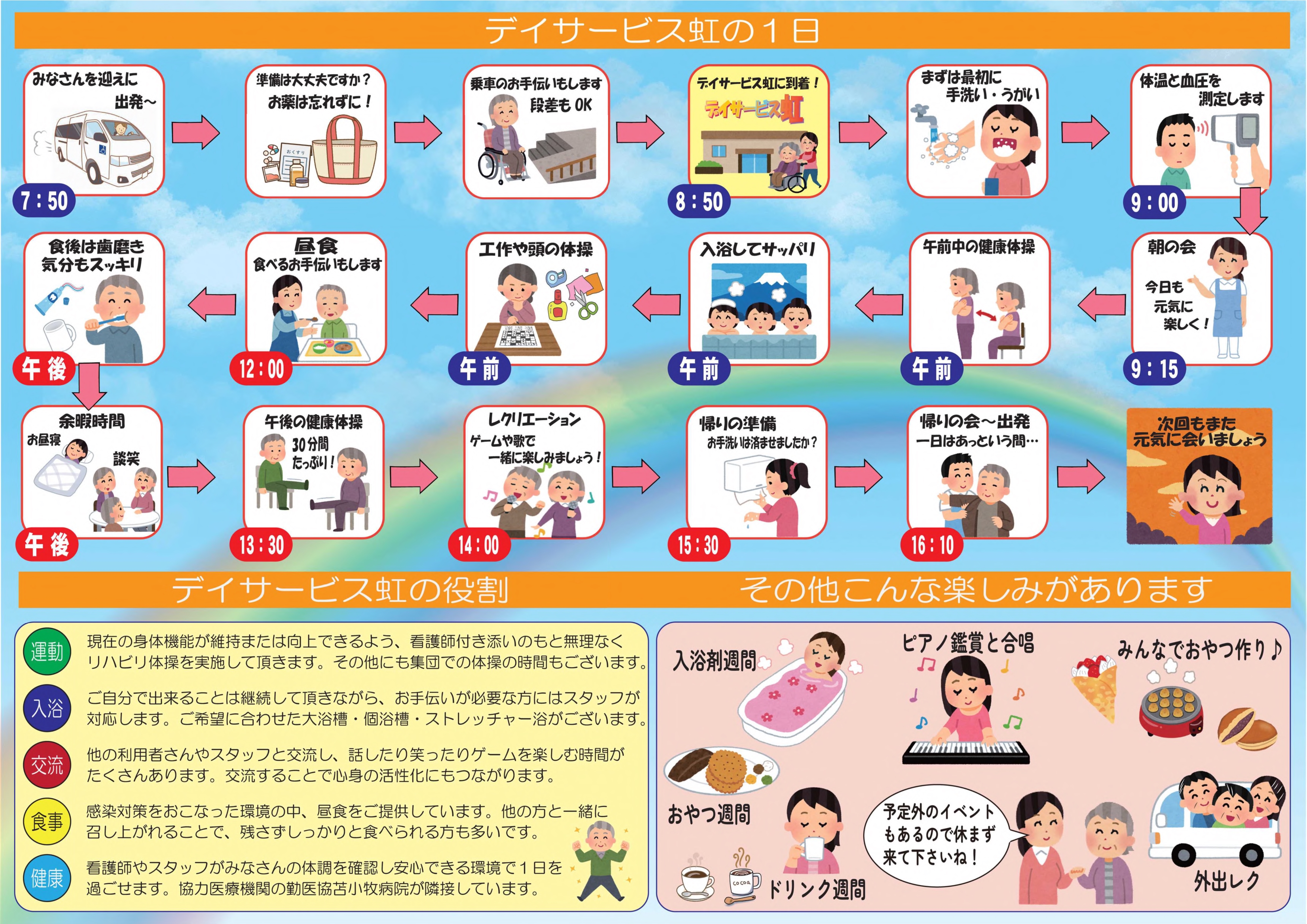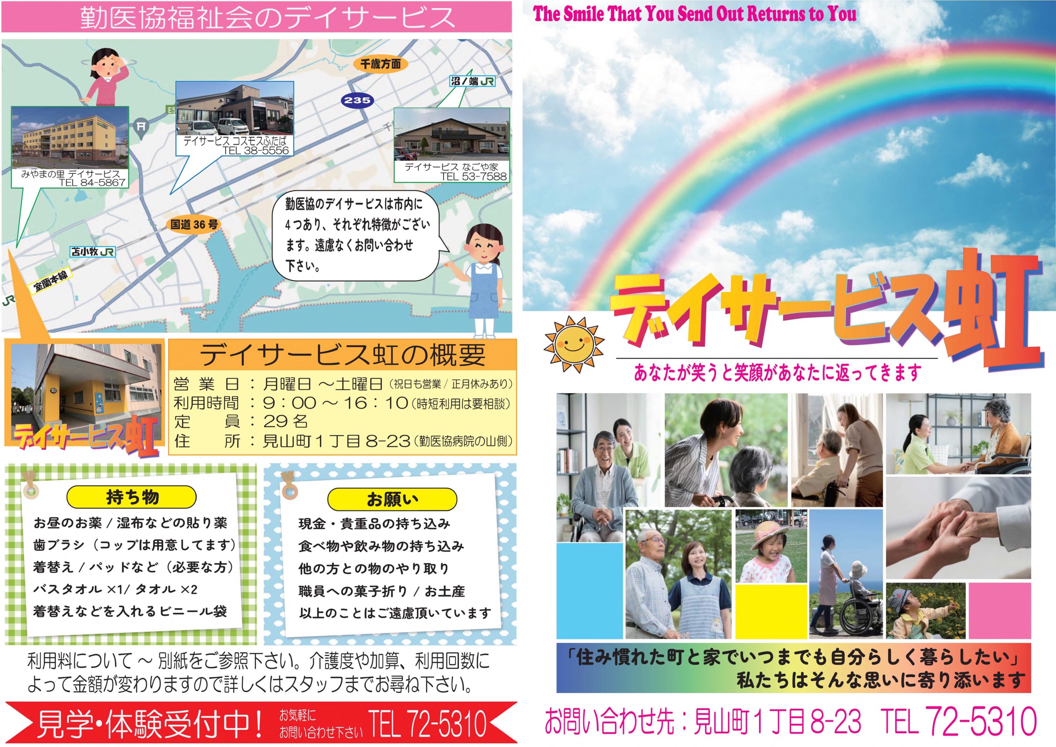 勤医協苫小牧デイサービス虹 通所介護【デイサービス】 事業所概要 アクセス 勤医協苫小牧デイサービス虹 パンフレット紹介 勤医協苫小牧デイサービス虹 パンフレット紹介 パンフレット印刷はこちらから 事業所概要 事業所概要 住所〒053-0855苫小牧市見山町1丁目8-23勤医協苫小牧病院内電話番号0144-72-5310FAX番号0144-74-8788営業日営業時間月曜日~土曜日 但し 12月31日~1月2日を除く午前8時30分~午後5時30分サービス提供地域苫小牧市重要事項の掲示重要事項説明書 アクセス アクセス 道南バス 苫小牧駅前(鉄北北口線、錦西文化公園線等)⇒北光小学校前下車⇒徒歩(約5分) 勤医協苫小牧在宅総合センター 通所介護【デイサービス】 サービス紹介TOP