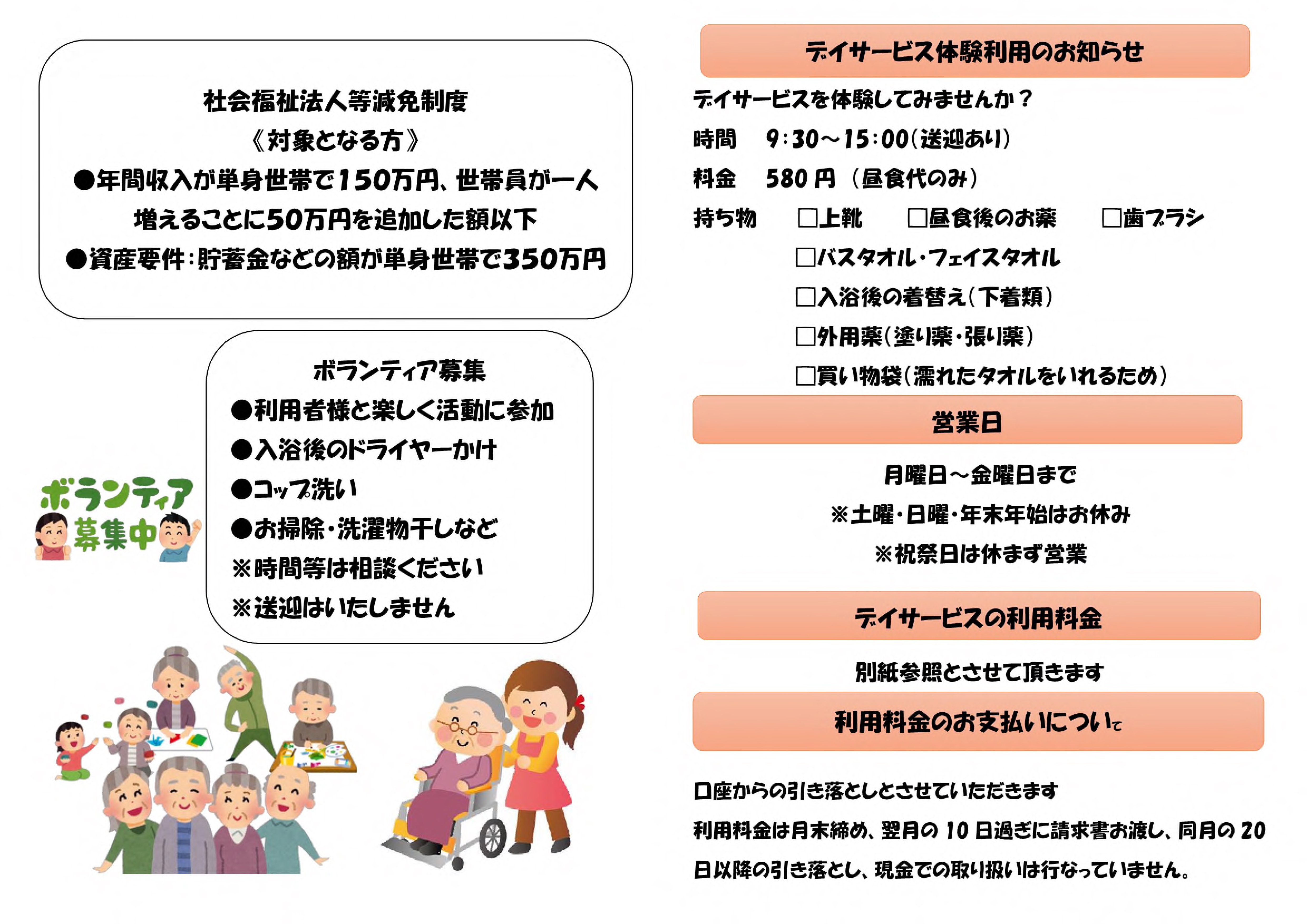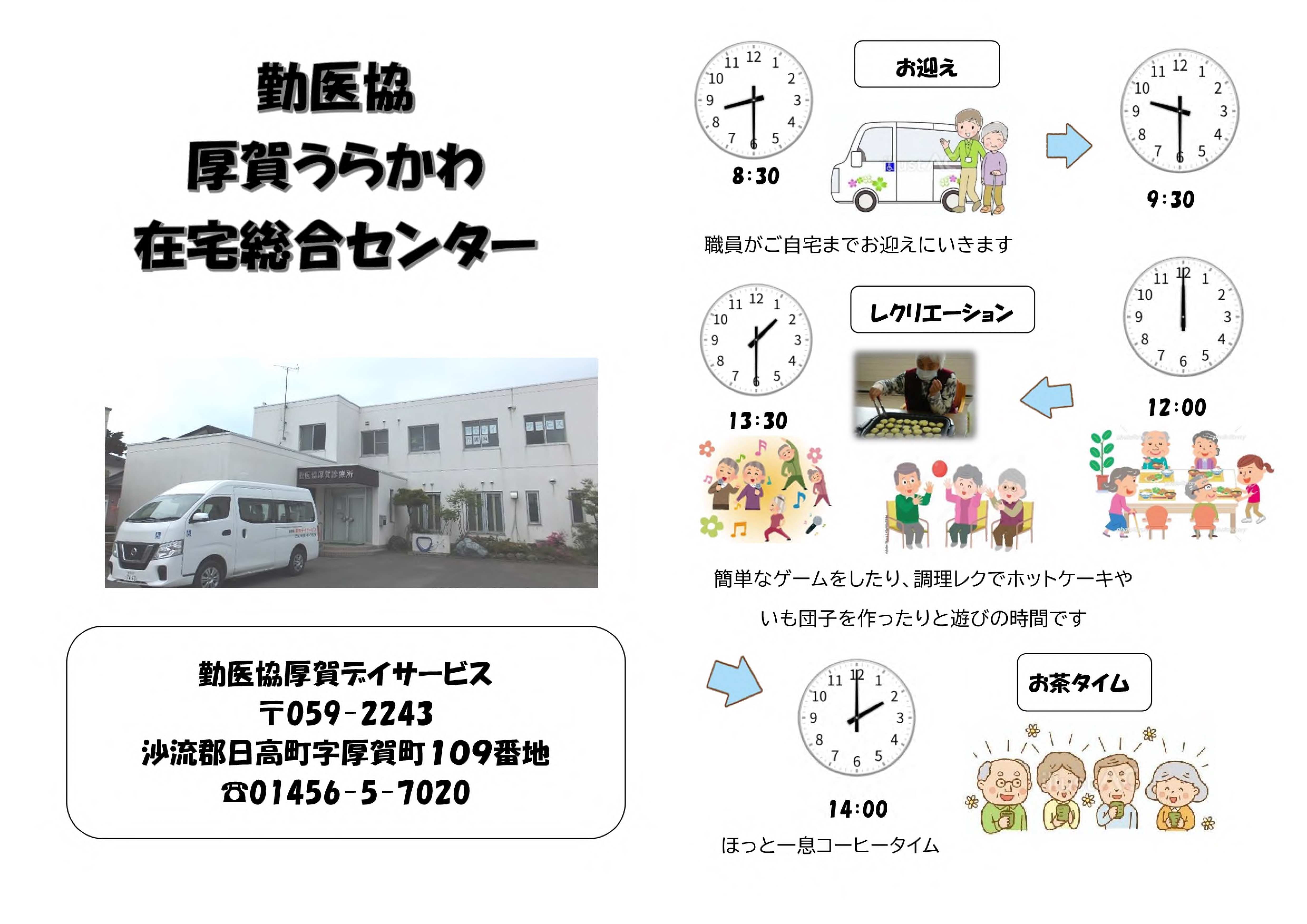 勤医協厚賀デイサービス 地域密着型通所介護【小規模デイサービス】 事業所概要 アクセス 勤医協厚賀デイサービス パンフレット紹介 勤医協厚賀デイサービス パンフレット紹介 パンフレット印刷はこちらから 事業所概要 事業所概要 住所〒059-2243沙流郡日高町字厚賀町109番地電話番号01456-5-7020FAX番号01456-5-7020営業日営業時間月曜日~金曜日 但し 12月30日~1月3日を除く午前9時~午後5時サービス提供地域日高町・新冠町重要事項の掲示重要事項説明書 アクセス アクセス 道南バス 厚賀第一停留所より徒歩2分JR厚賀駅から徒歩10分(JR代行バスあり) 勤医協厚賀うらかわ在宅総合センター 地域密着型通所介護【小規模デイサービス】 サービス紹介TOP