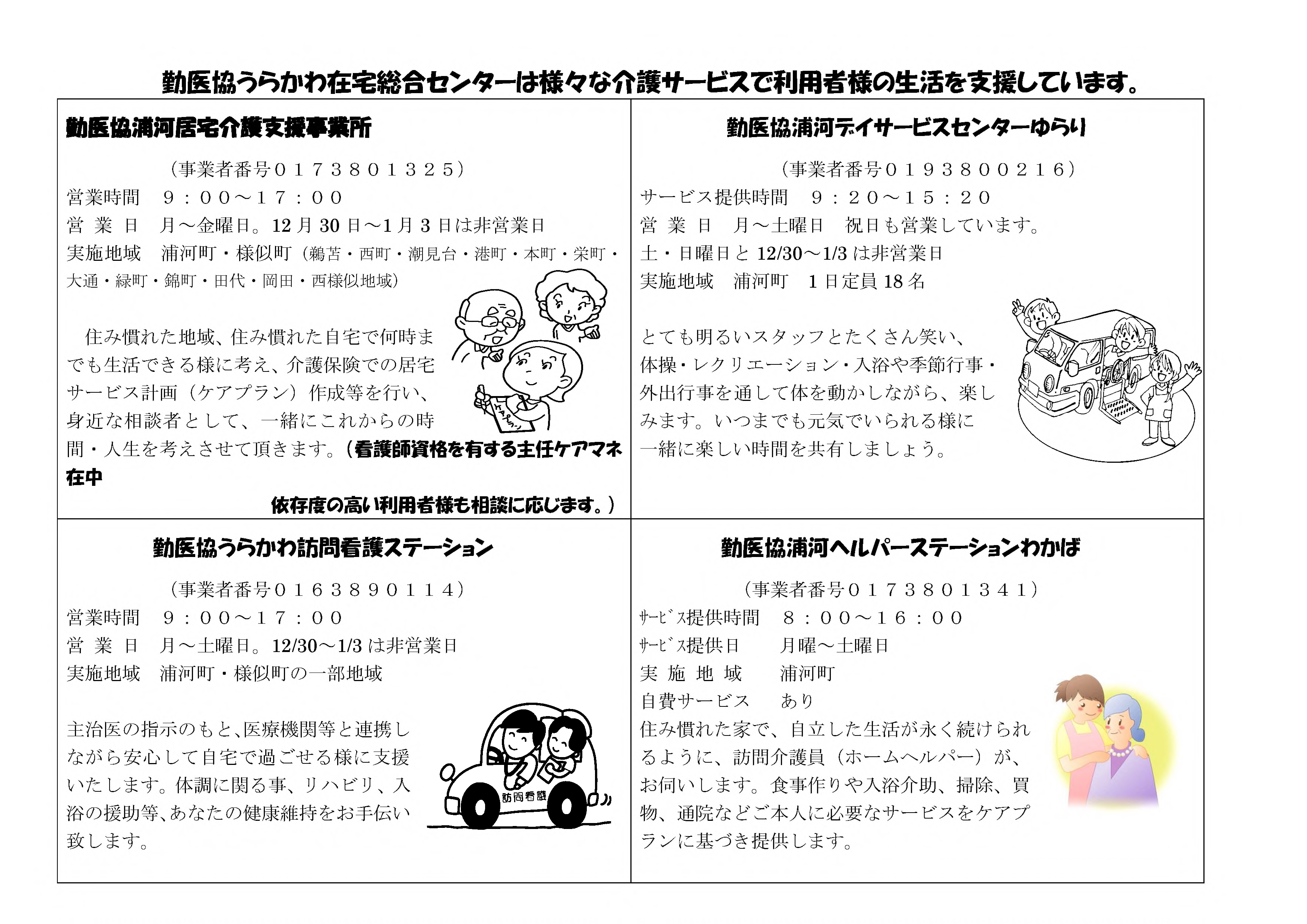 勤医協浦河居宅介護支援事業所 居宅介護支援 事業所概要 アクセス 勤医協浦河居宅介護支援事業所 パンフレット紹介 勤医協浦河居宅介護支援事業所 パンフレット紹介 パンフレット印刷はこちらから 事業所概要 事業所概要 住所〒057-0024浦河郡浦河町築地2丁目1-2電話番号0146-22-1913FAX番号0146-22-2651営業日営業時間月曜日~金曜日 但し 12月30日~1月3日を除く午前9時~午後5時サービス提供地域浦河町・様似町(鵜苫・西町・潮見台・港町・本町・栄町・大通・緑町・錦町・田代・岡田・西様似地域)重要事項の掲示重要事項説明書 アクセス アクセス JRバス浦河役場前より徒歩5分 勤医協厚賀うらかわ在宅総合センター 居宅介護支援 サービス紹介TOP