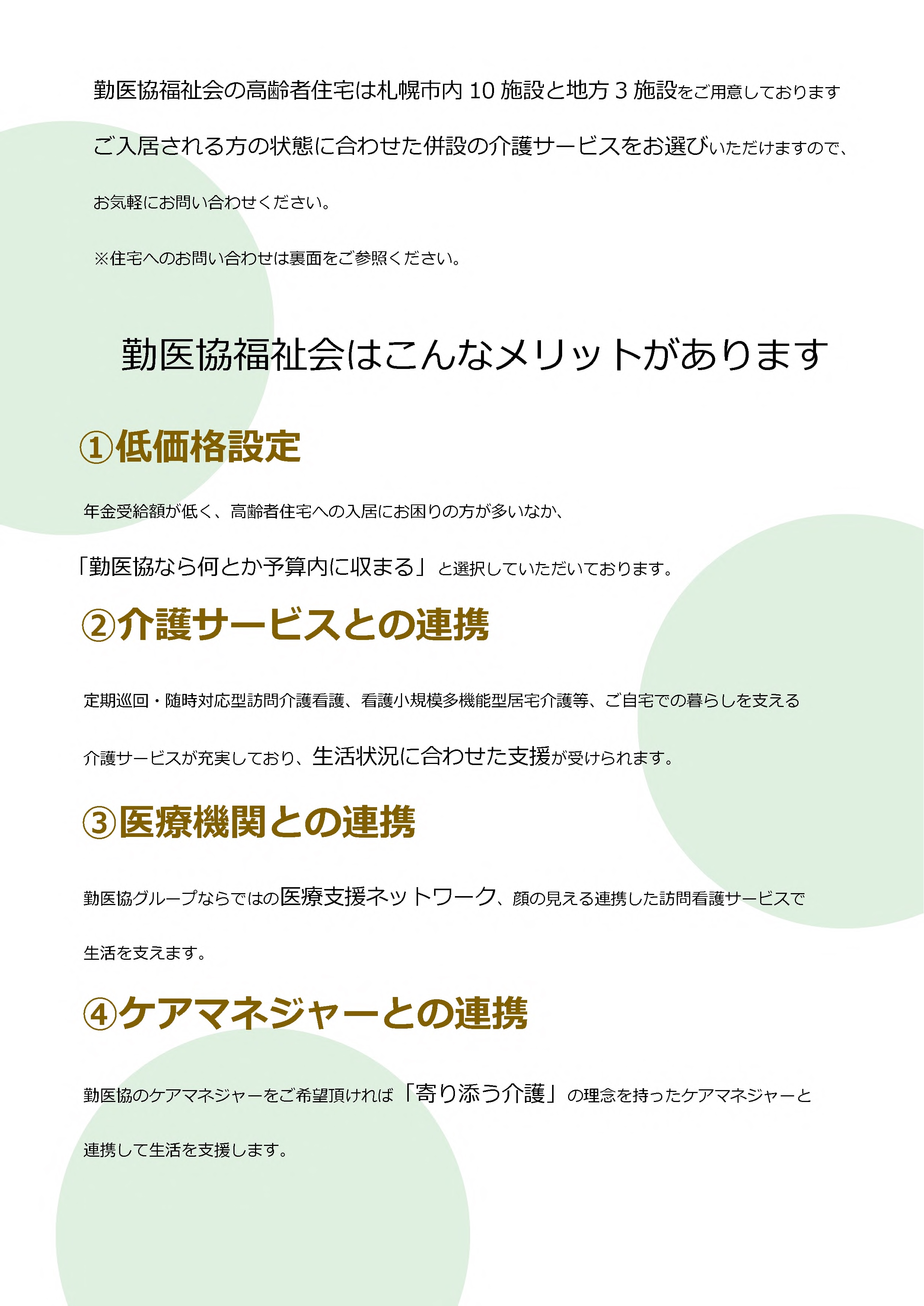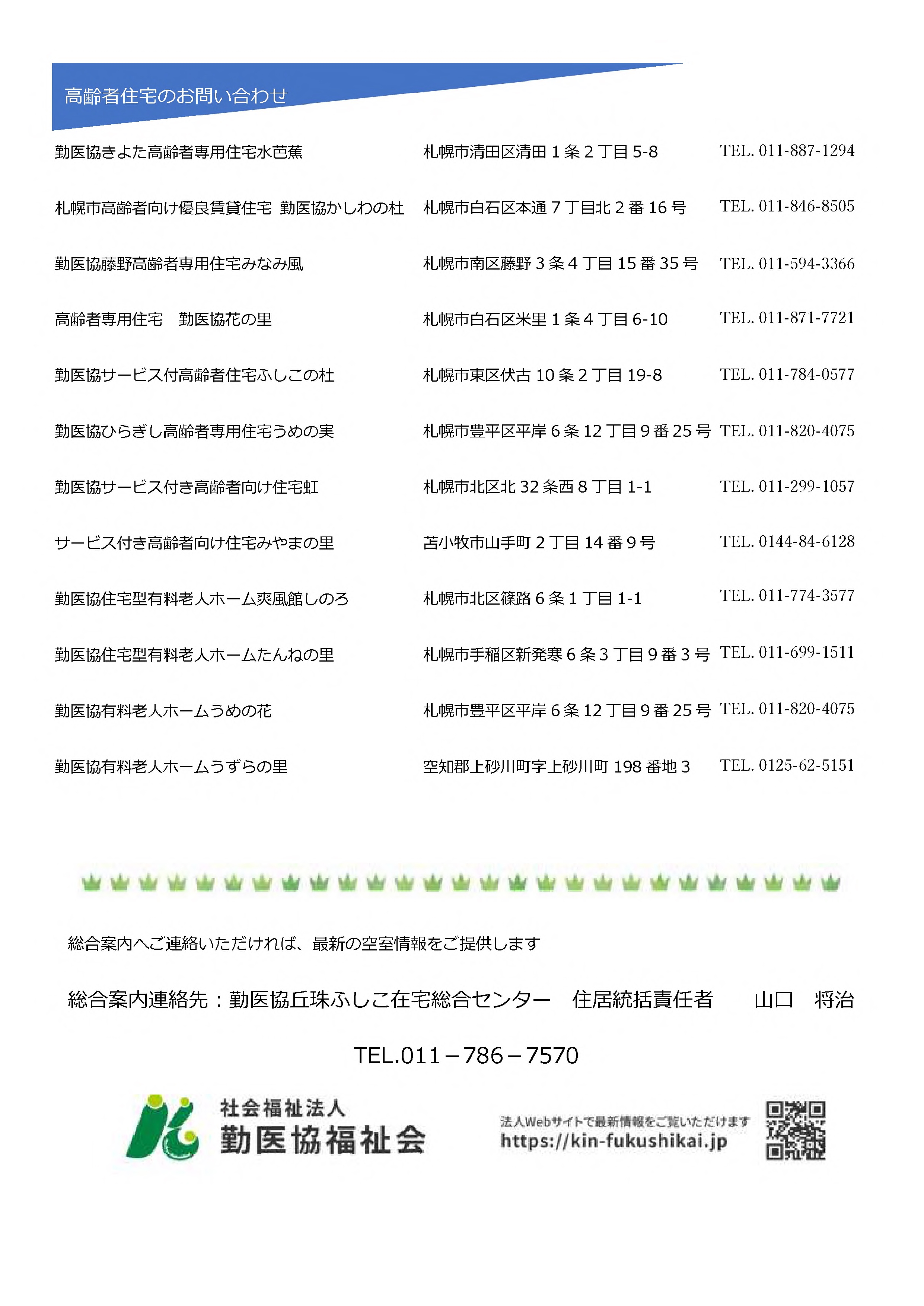 トピックス 2025/11/20 勤医協福祉会の高齢者住宅ご案内 TOPICS 詳細は、各住宅のホームページをご覧ください。パンフレットをダウンロードできます。サービス付き高齢者向け住宅はこちらから有料老人ホームはこちらから 一覧にもどる